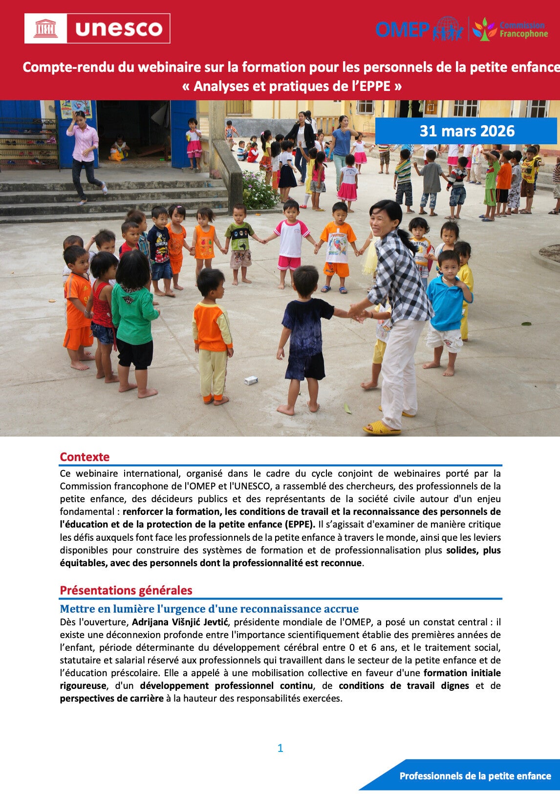 L'UNESCO et la Commission francophone de l'Organisation mondiale pour l'éducation préscolaire (OMEP) ont le plaisir de vous inviter à un webinaire intitulé « Renforcer la formation et la professionnalisation du personnel de l'éducation et de la protection de la petite enfance (EPPE) », qui se tiendra le mardi 31 mars 2026, de 14h00 à 15h30 (CEST), en ligne.