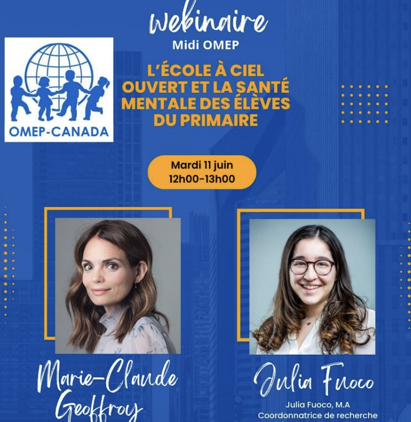 Webinaire sur « L’École à ciel ouvert et la santé mentale des élèves du primaire » par Marie-Claude Geoffroy et Julia Fuoco.