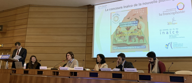 - Un concours de la « nouvelle plurilingue » organisé avec l’Inalco, avec une contrainte linguistique qui consiste à écrire en plus d’une langue, ainsi que des éditions d’œuvres hétérolingues/plurilingues (avec l’école Estienne)